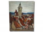 Henri BIARD (1918-2001) Le clocher dominant les toits de tuile Huile sur toile 61 x 50 cm