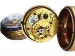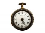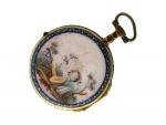 Montre en métal doré avec un double boîtier. Boîtier sur charnière extérieur, le dos en émail polychrome représentant une scène champêtre avec au centre une allégorie à la musique. Boîtier intérieur lisse. Cadran émail blanc avec chiffres romains pour les heures et arabes pour les minutes, minuterie chemin de fer, signé. Mouvement à coq, échappement à verge, balancier spiral, signature sur la platine.