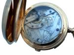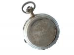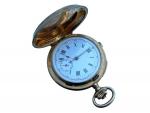 Montre de poche savonnette en or 750 millièmes sonnerie avec chronographe. Boîtier dit " bassine " sur charnière, fond transparent, cuvette en or lisse. Cadran émail blanc avec chiffres romains pour les heures et arabes pour les minutes, petite trotteuse et minuterie chemin de fer. Mouvement mécanique, remontage à couronne, platine trois quarts, balancier spiral, raquette de réglage avance/retard.