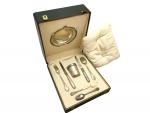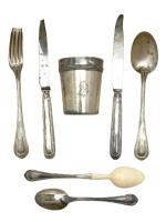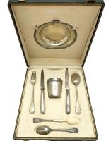 SERVICE DE BAPTEME en argent, chiffré, comprenant coupelle à bouillie, timbale, fourchette, cuillère, couteau à fromage, couteau à fruits, cuillère à thé, cuillère à bouillie