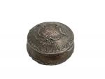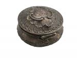 BOITE A PILULES couverte en argent à décor au repoussé, chiffrée Minerve. Orfèvre: Henri CHEVRON (1879-1883) H.: 3 cm D.: 5.5 cm Poids: 36 gr (légers chocs)