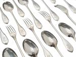 Suite de dix-huit COUVERTS A DESSERT en argent, modèle filets années 40, chiffrés Minerve. Orfèvre: Jacques...