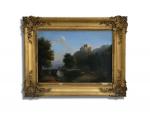 école de Jean Victor BERTIN (1767-1842) Paysage aux vaches devant un château Huile sur toile portant une signature apocryphe en bas à gauche 33 x 46 cm