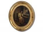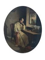 ECOLE FRANCAISE du XIXème Moine tenant une épée Huile sur panneau ovale 41 x 32 cm (griffures)
