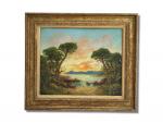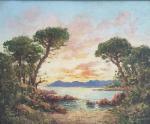 ECOLE MEDITERRANEENNE début XXème Coucher de soleil sur la mer Huile sur panneau signée en bas à droite 37 x 46 cm
