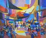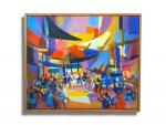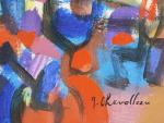 Jean CHEVOLLEAU (1924-1996) Marché multicolore, 1990. Huile sur toile signée en bas à droite, contresignée, titrée, datée et dédicacée au dos 46 x 51 cm
