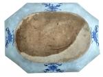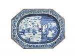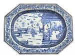 CHINE Grand plat octogonal en porcelaine à décor bleu blanc de personnages près d'une pagode XVIIIème 33 x 44 cm