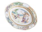 CHINE Compagnie des Indes Bassin ovale en porcelaine à décor famille rose de personnages attablés XIXème 22.5 x 29 cm (fêles, usures au décor)