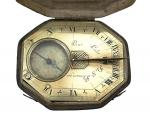 CADRAN SOLAIRE en laiton de forme octogonale, formant boussole, annoté "Pour Lisle De St Domaingue", signé Baradelle à Paris XVIIIème 6.5 x 8 cm (dans son écrin d'origine à la forme)