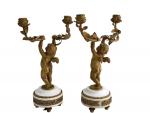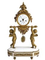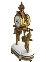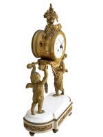 GARNITURE DE CHEMINEE en marbre blanc et bronze doré, la pendule portique figurant deux angelots portant un palanquin sur lequel est posé la pendule, elle-même surmontée d'une guirlande de fleurs, feuilles, colombes, carquois, cases et torche, le cadran émaillé à quantièmes signé "Vaillant à Paris", les candélabres figurant chacun un angelot tenant deux bras de lumière