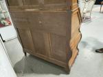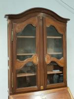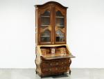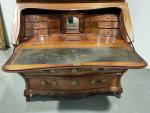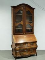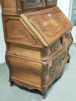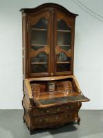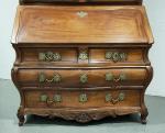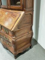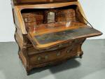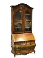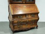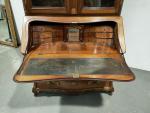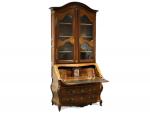 SCRIBAN bordelais de forme galbée, en acajou sculpté et mouluré, la partie basse ouvrant à quatre tiroirs sur trois rangs, la partie haute ouvrant à un abattant dégageant un intérieur compartimenté, surmontée de deux portes vitrées, la traverse basse sculptée en saillie de fleurs et feuillage