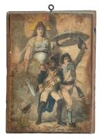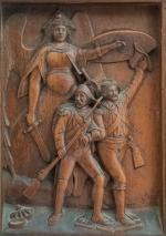 ECOLE FRANCAISE fin XIXème L'Armée du Peuple, ou La République protégeant un soldat et un paysan Bas relief en bois sculpté, monogrammé "L.A." 24 x 17.5 cm hors tour