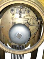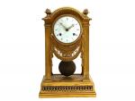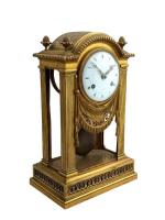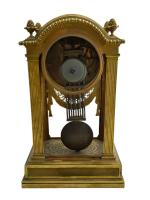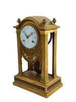 PENDULE CAGE en bronze doré à quatre pilatres cannelés, le cadran émaillé à quantième de jour signé Kinable, surmonté d'une draperie, la base ajourée à décor d'une frise de palmettes