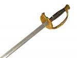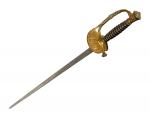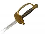 Épée d'Officier d'État-major, modèle 1817 à ciselures. Fusée en corne, avec filigrane. Monture en laiton, ciselé. Garde à une branche. Clavier aux trois fleurs de lys sur écu couronné, entouré de feuillages, sur faisceau de drapeaux. Contre-clavier fixe. Lame à dos et pans creux, gravée au tiers, marqué au talon " Menilozza 1844 Napoli ". EM SF (accidents à la corne)