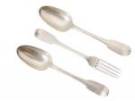 Suite de deux CUILLERES et une FOURCHETTE en argent, modèle uniplat, gravées d'armoiries d'alliance sous un heaume de chevalier Saint Omer, fin XVIIIème Maitre orfèvre: LF une fleur Poids: 176 gr