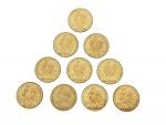 Lot de 10 pièces de 20 francs or au coq Lot conservé en banque, vendu sur désignation