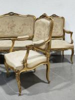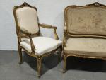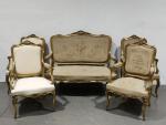 SALON en bois sculpté et doré comprenant un canapé et quatre fauteuils Style Louis XV, fin XIXème L. (canapé): 130 cm
