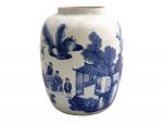 Importante jarre en porcelaine blanche à décor en bleu sous couverte de trois dignitaires autour d'une table à jeux et un serviteur près d'une habitation. Un poème calligraphié d'après Su Dongpo (1037-1101) évoquant les plaisirs de la vie complète l'ornementation.