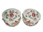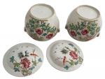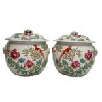 CHINE Paire de terrines couvertes en porcelaine à décor famille rose de fleurs, feuillage et oiseau, au dos des sinogrammes H.: 19.5 cm
