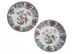 CHINE Compagnie des Indes Paire d'assiettes rondes en porcelaine à décor famille rose XVIIIème D.: 22.7 cm (fêles)