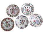 CHINE Compagnie des Indes Cinq assiettes rondes en porcelaine, différents modèles famille rose XVIIIème D.: 23 cm (égrenures, fêles et restaurations)