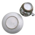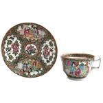 CHINE Canton Tasse et sa soucoupe en porcelaine à décor de personnages et fleurs H. (tasse): 7.2 cm (petit éclat)