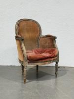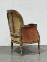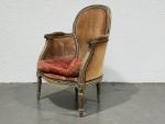 Petite BERGERE en bois mouluré et rechampi, les montants cannelés Style Louis XVI H.: 86 cm (fentes, usures)