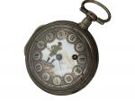 MONTRE en argent. Boîtier sur charnière. Cadran avec pastilles chiffrées romains pour les heures et minuterie chemin de fer externe, au centre un émail polychrome avec la figure de l'empereur Napoléon 1er regardant la mer avec une longue vue. Mouvement avec remontage à clef, échappement à verge, coq ciselé et percé, balancier spiral et disque de réglage, signature sur la platine.
