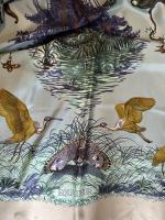 HERMÈS Paris " Équateur " par Robert Dallet 1ère édition en 1998 re 2019 Carré en soie imprimée à fond vert et indigo 140 x 140