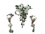 PARURE en or gris et émeraudes, perles et pierres imitations comprenant une broche et des pendants d'oreilles poids 32 g (la broche est en alliage d'or 585 millièmes - les boucles d'oreilles son en alliage d'or 375 millièmes)