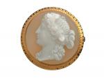 BROCHE camée profil de femme, monture en or jaune (traces d'émail noir), épingle en métal, poids brut 14,5g, diam 3,5cm