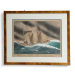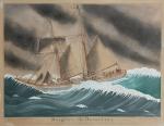 Gouache et aquarelle signée, titrée, située "La Chaume, rue de l'Ysev, Les Sables d'Olonne, Vendée" et annotée "La Goëlette Bergère de Domrémy du port de St Brieux venant de Dunkerque aux Sables d'Olonne, avec un chargent de phosphate, est surprise par une violente tempête de l'Ouest - Sud - Ouest, au large de l'île d'Yeu. Puis le vent tourne à l'Ouest - Nord - Ouest. La mer est affreuse, mais la vaillante goëlette, bonne marcheuse, sous sa voilure très réduite, peut, malgré le temps, arriver à bon port"
