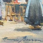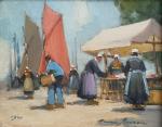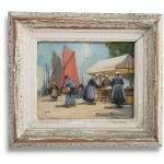 Henri BURON (1880-1969) Le marché aux poissons devant les bateaux, 1941. Huile sur carton signée et datée 9 x 11.5 cm