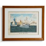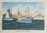 Gouache et aquarelle signée, titrée et annotée "Port Joinville. Ile d'Yeu Vendée En 70 minutes, le paquebot Insula Oya accomplit sa traversée pour Fromentine