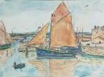 André FRAYE (1889-1963) Les Sables d'Olonne, voiliers sortant du port Aquarelle signée en bas à droite 28.5 x 38.5 cm à vue (petites piqûres)