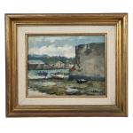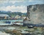 René LEFORESTIER (1903-1972) Concarneau, barques au pied de la ville close Huile sur panneau signée en bas à droite 18.5 x 23.5 cm
