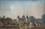 ECOLE FRANCAISE du XIXème Départ pour la chasse à courre devant le château Gouache sur carton 26.5 x 40.5 cm à vue