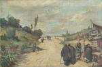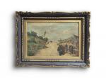 ECOLE d'EUROPE DE L'EST Personnages sur le chemin Huile sur toile signée en bas à gauche 40.5 x 60.5 cm (petits accidents)