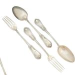 Suite de douze FOURCHETTES A DESSERT et dix CUILLERES A DESSERT en argent, modèle filets coquilles, gravées d'armoiries sous une couronne de marquis