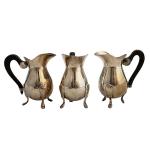 Suite de trois POTS A LAIT en argent uni, reposant sur trois pieds patins, les anses en bois noirci