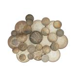 Lot de PIECES en argent, comprenant 8 pièces de 50 francs, 2 pièces de 10 francs, 1 pièce de 5 francs, et 19 pièces diverses dont 1 franc, one penny, 2 francs...