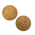 Deux PIECES or 20 francs, Génie de la République 1897 et Coq 1911 Lot conservé en banque, vendu sur désignation
