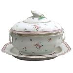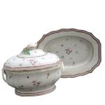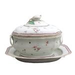 CHINE Compagnie des Indes Terrine couverte et son présentoir en porcelaine à décor famille rose de fleurs XVIIIème L.: 31 cm (petite restauration au frétel)