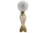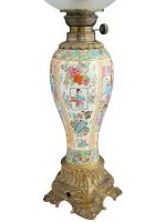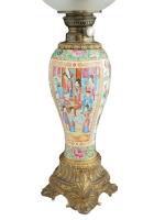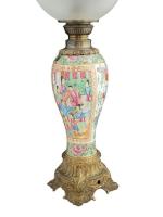 CHINE Canton Lampe à pétrole en porcelaine et bronze, le globe en verre Fin XIXème H. totale: 60 cm