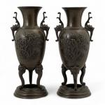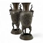 JAPON Paire de VASES en bronze à patine brune munis de deux anses, à décor d'oiseaux branchés, reposant sur trois bien à décor de têtes de chiens de Fô. Vers 1900 H: 35 cm