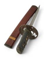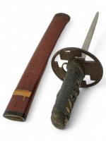 JAPON Poignard et son fourreau, complet de sa garde L.: 35.5 cm (accident au fourreau, manque le Kozuka)