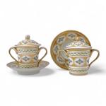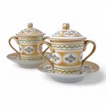Paire de TASSES à la reine trembleuses et couvertes en porcelaine de Paris, à décor floral polychrome en réserve et doré. XIXème siècle H: 12 cm, Diam sous-tasse: 15 cm