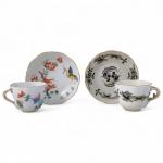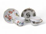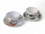 MEISSEN Deux TASSES et SOUS-TASSES en porcelaine, l'une à décor de dragons et phoenix polychrome et liserés doré, l'autre à décor de grue et chimère XIXème siècle H: 5, Diam 11 cm