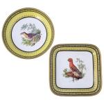 SEVRES ASSIETTE creuse et COMPOTIER à décor d'un toucan à gorge jaune de Cayenne, et d'un coq de Roche du Pérou, en polychromie, aile à fond jaune, liseré doré XIXème siècle