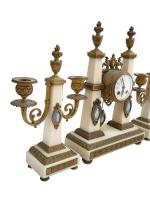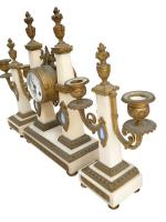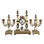 GARNITURE DE CHEMINEE en marbre blanc, bronze doré et médaillons et Wedgwood, la pendule de forme portique surmontée de pots à feu, le cadran émaillé, les candélabres à deux bras de lumière au modèle